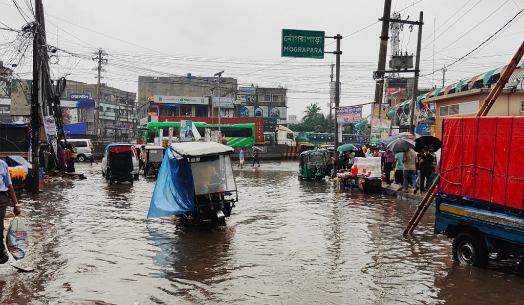 নারায়ণগঞ্জের সোনারগাঁ উপজেলার মোগরাপাড়া চৌরাস্তা এলাকায় ঠিকাদারির গাফিলতিতে সৃষ্টি হয়েছে ভয়াবহ জলাবদ্ধতা। সাম্প্রতিক বৃষ্টিপাতের ফলে উঁচু করে নির্মিত ড্রেনের কারণে পানি নিষ্কাশনের কোনো উপযুক্ত ব্যবস্থা না থাকায় এই জলাবদ্ধতার সৃষ্টি হয়েছে। ফলে ভোগান্তিতে পড়েছেন পথচারী, যানবাহন চালক ও স্থানীয় ব্যবসায়ীরা।