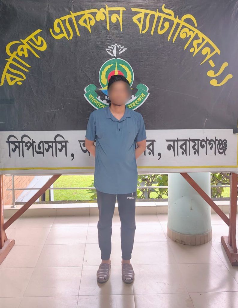 নারায়ণগঞ্জের রূপগঞ্জে চাঁদা না দেওয়ায় ব্যবসায়ীকে গুলির ঘটনায় জড়িত চিহ্নিত সন্ত্রাসী শফিকুল ইসলাম শফিক (৩৬)-কে রাজধানীর সবুজবাগ এলাকা থেকে গ্রেফতার করেছে র্যাব-১১। এ সময় তার কাছ থেকে একটি বিদেশি রিভলবার ও চার রাউন্ড গুলি উদ্ধার করা হয়।