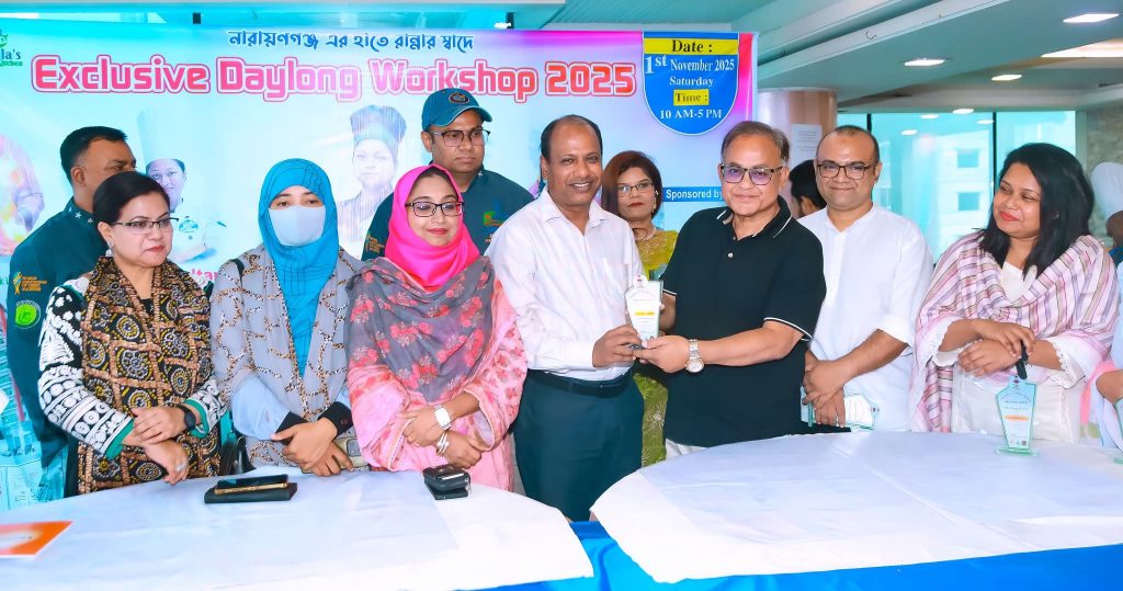 নারায়ণগঞ্জে নারী উদ্যোক্তাদের অংশগ্রহণে অনুষ্ঠিত হলো “মিথিলা’স কিচেন” এর শুভ উদ্বোধন ও এক্সক্লুসিভ ডায়লক ওয়ার্কশপ। অনুষ্ঠানে মানব কল্যাণ পরিষদের চেয়ারম্যান এম এ মান্নান ভূঁইয়া-কে সম্মাননা স্মারক প্রদান করা হয়।
