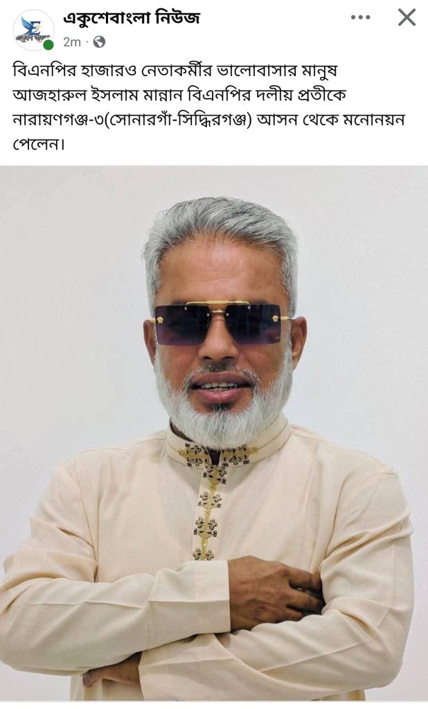 নারায়ণগঞ্জ-৩ আসনে ধানের শীষের প্রার্থী আজহারুল ইসলাম মান্নান