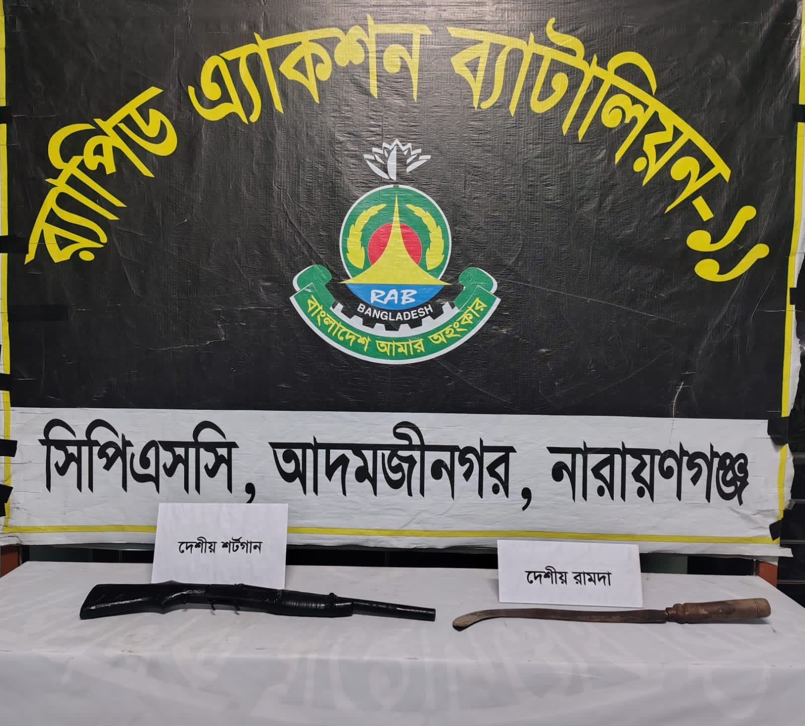 এরই ধারাবাহিকতায় ২৭ নভেম্বর ২০২৫ ইং তারিখ সন্ধ্যা আনুমানিক ৬টার দিকে র্যাব-১১, সিপিএসসি, নারায়ণগঞ্জ এর একটি চৌকস দল সুনির্দিষ্ট তথ্যের ভিত্তিতে হোগলাকান্দি এলাকায় অভিযান চালায়। অভিযানে একটি পরিত্যক্ত স্থানে লুকানো অবস্থায় দেশীয় একটি শর্টগান ও একটি রামদা উদ্ধার করা হয়।