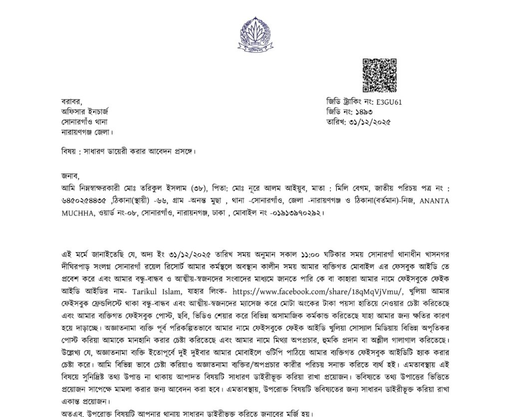 জিডিতে বলা হয়, উক্ত আইডি থেকে বিভিন্ন সময় তরিকুল ইসলামের বন্ধু-বান্ধব ও আত্মীয়স্বজনদের কাছে তার নাম ব্যবহার করে অর্থ দাবি করা হচ্ছে। একইসঙ্গে তার বিরুদ্ধে মিথ্যা তথ্য প্রচার, মানহানিকর বক্তব্য এবং কুরুচিপূর্ণ মন্তব্য করে সামাজিকভাবে হেয় প্রতিপন্ন করার অপচেষ্টা চলছে।