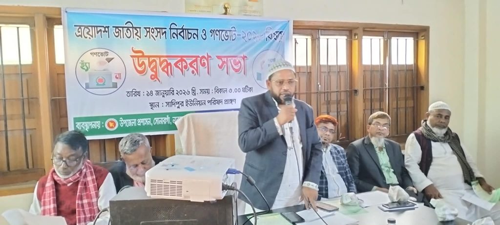 সোনারগাঁ প্রতিনিধি ঃ ত্রয়োদশ জাতীয় সংসদ নির্বাচন ও গণভোট-২০২৬ এর বিষয়ে সোনারগাঁয়ের সাদিপুর ইউনিয়ন পরিষদে উদ্বুদ্ধকরণ সভা অনুষ্ঠিত হয়েছে। বুধবার(১৫ জানুয়ারি) বিকেল ৩টায় সাদিপুর ইউনিয়ন পরিষদ প্রাঙ্গণে এ সভা অনুষ্ঠিত হয়।