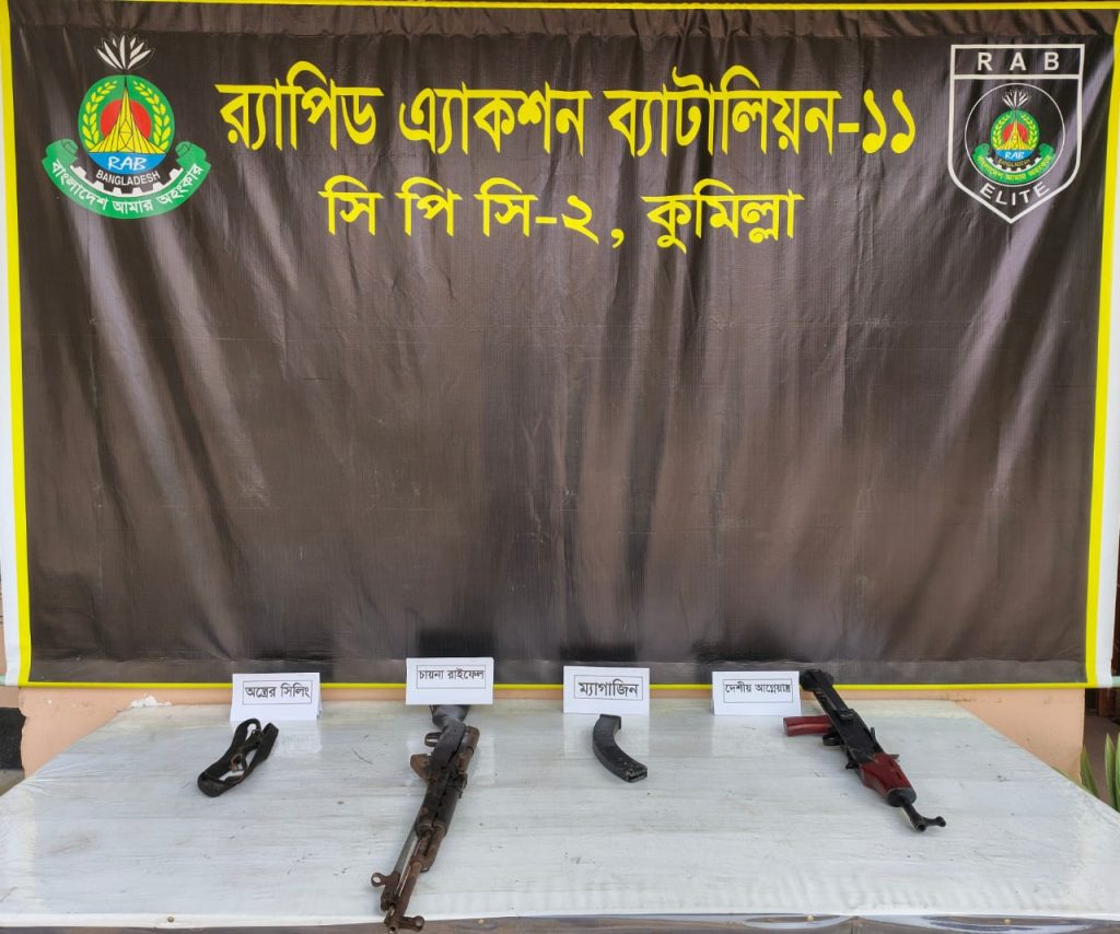 র‍্যাব-১১, সিপিসি-২ এর একটি বিশেষ আভিযানিক দল গোপন সংবাদের ভিত্তিতে কুমিল্লা জেলার মুরাদনগর থানাধীন লাজৈর এলাকায় অভিযান চালিয়ে পুলিশের লুট হওয়া একটি চাইনিজ রাইফেল ও একটি দেশীয় তৈরি আগ্নেয়াস্ত্র উদ্ধার করেছে।
