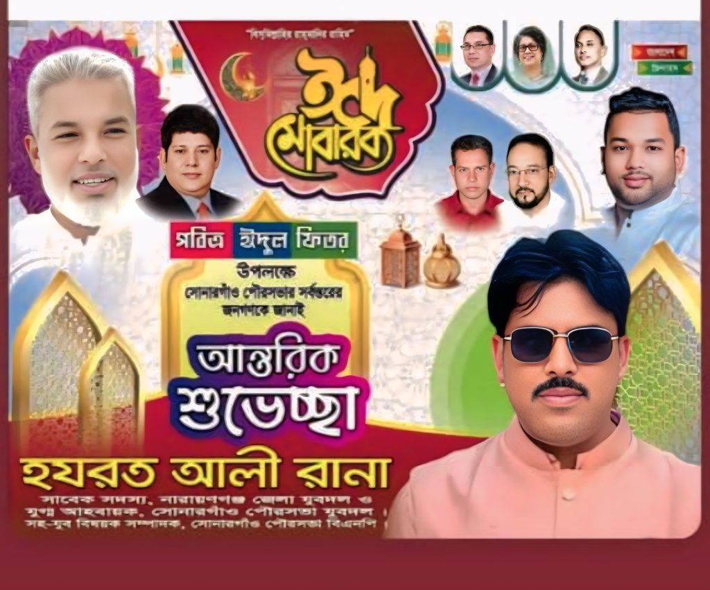 নারায়ণগঞ্জের ঐতিহ্যবাহী সোনারগাঁবাসীসহ দেশ-বিদেশে অবস্থানরত সকল মুসলিম ভাই-বোনকে পবিত্র ঈদুল ফিতর উপলক্ষে আন্তরিক শুভেচ্ছা ও মোবারকবাদ জানিয়েছেন রাজপথের সংগ্রামী নেতা হযরত আলী রানা, সাবেক সদস্য নারায়ণগঞ্জ জেলা যুবদল, যুগ্ম আহ্বায়ক সোনারগাঁও পৌরসভা যুবদল ও সহ-যুব বিষয়ক সম্পাদক সোনারগাঁও পৌরসভা বিএনপি।