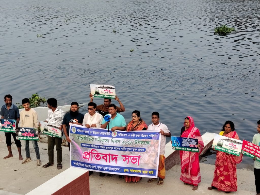 আন্তর্জাতিক নদীকৃত্য দিবস ২০২৬ উপলক্ষে নারায়ণগঞ্জের বন্দর উপজেলার ঐতিহাসিক তীর্থস্থান লাঙ্গলবন্দ রাজঘাটে পবিত্র ব্রহ্মপুত্র নদ রক্ষার দাবিতে প্রতিবাদ সভা অনুষ্ঠিত হয়েছে।